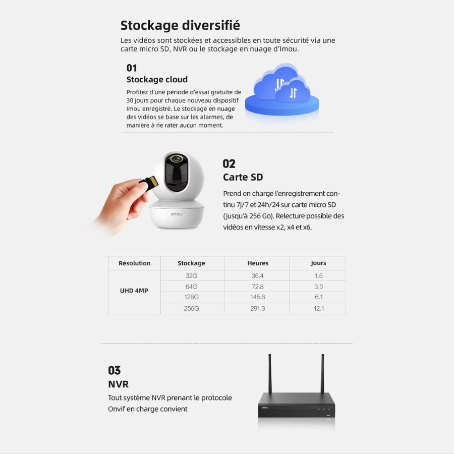Stockage sur Cloud ou carte SD (jusqu’à 256 Go, non incluse)
